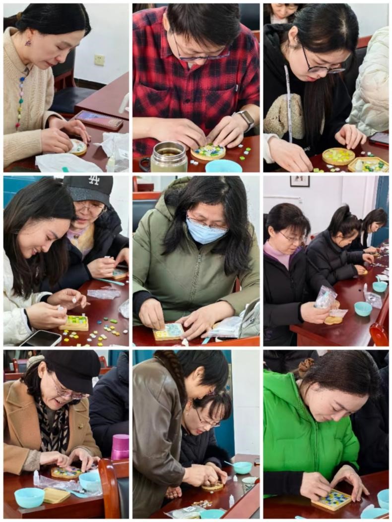 活动伊始,老师们各自挑选了喜爱的杯垫材料包,认真制作起来。DIY杯垫活动中老师们各自发挥聪明才智,将手中的马赛克方块按照形状和颜色精心排布在木质杯垫托上,形成了风格多样的杯垫款式。然后再将石膏粉加水调成糊状,老师们互相帮助加水调匀。最后再将半干的石膏粉小心翼翼地擦除,一个个造型精美的杯垫就制作完成了。活动结束后,工会还发放了洗衣液等节日慰问礼品。