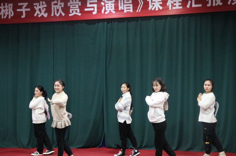选修课程女生表演的戏曲折扇组合舞蹈、水袖展示充分展示了梆子戏旦行的婀娜多姿;
