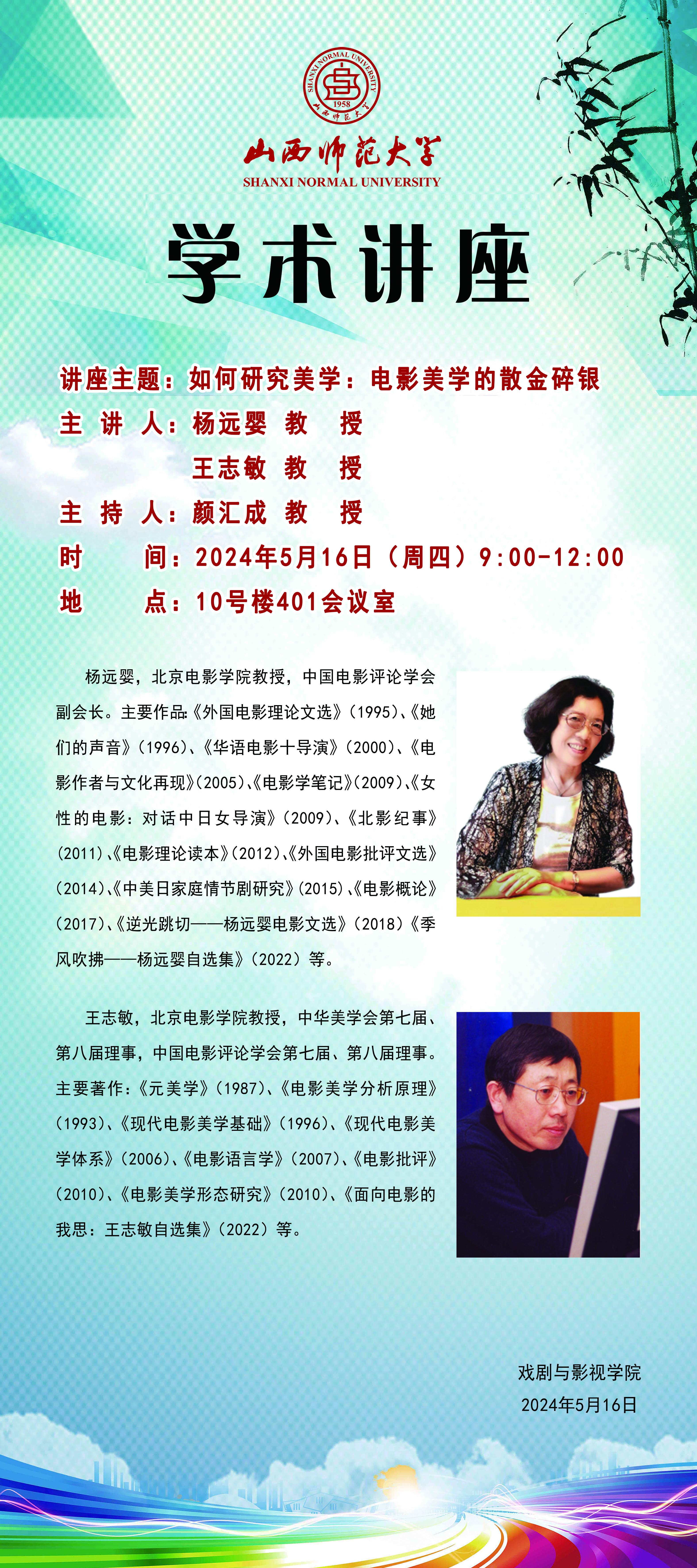 公司拟于2024年5月16日9:00—12:00在10号楼401会议室举办《如何研究美学:电影美学的散金碎银》讲座,主讲人为杨远婴、王志敏教授。