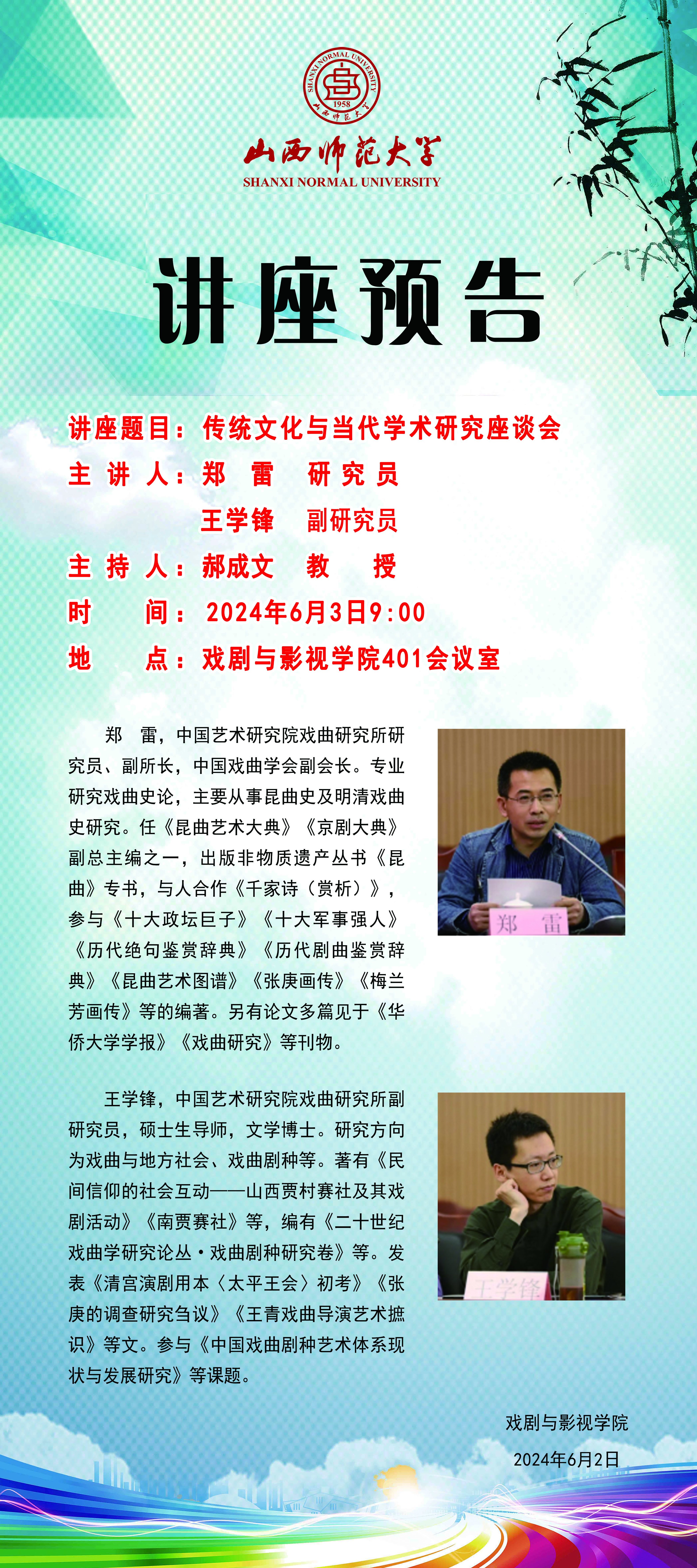 公司拟于2024年6月3日9:00在乐天使401会议室举办《传统文化与当代学术研究座谈会》专题讲座,主讲人为郑雷研究院、王学锋副研究员。
