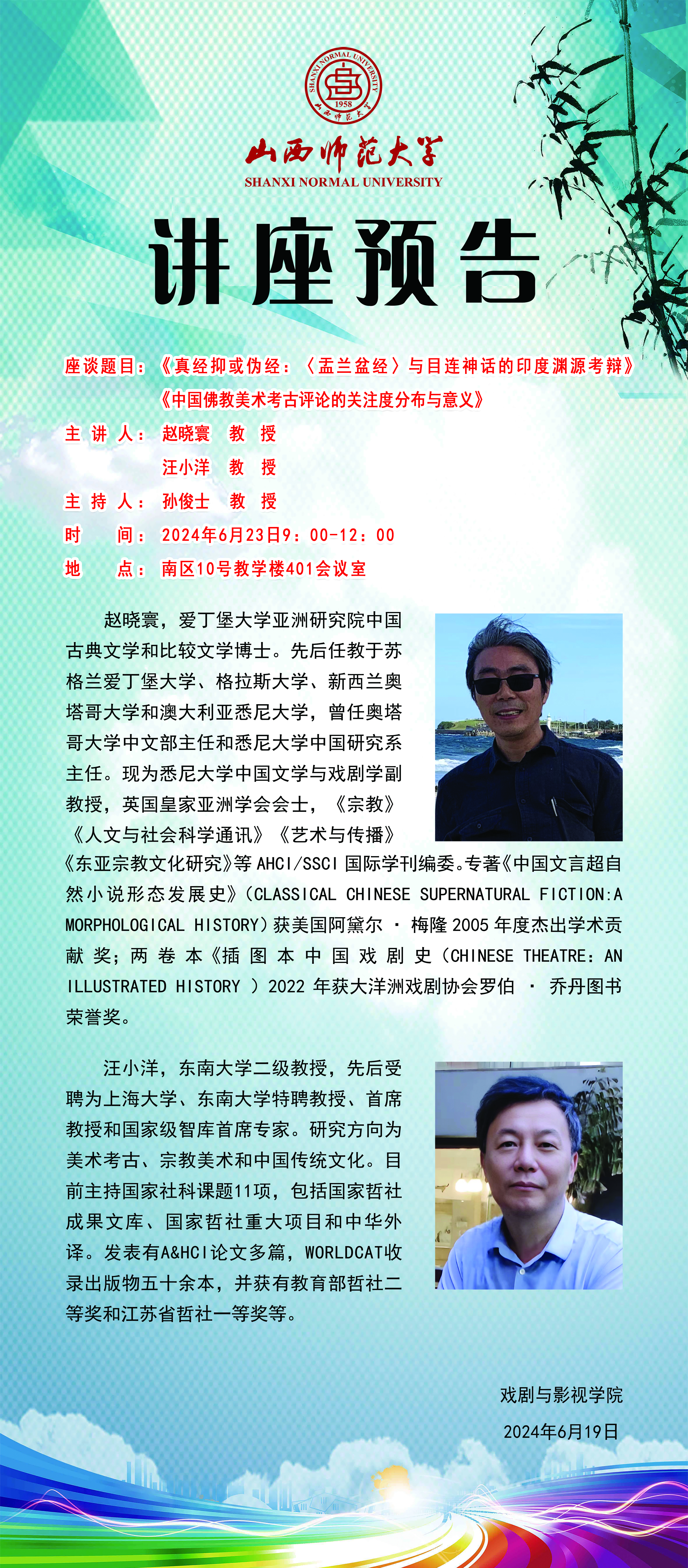 公司拟于2024年6月23日9:00—12:00在南区10号楼401会议室举办《真经抑或伪经:<盂兰盆经>与目连神话的印度渊源考辩》《中国佛教美术考古评论》讲座,主讲人为赵晓寰、汪小洋教授。