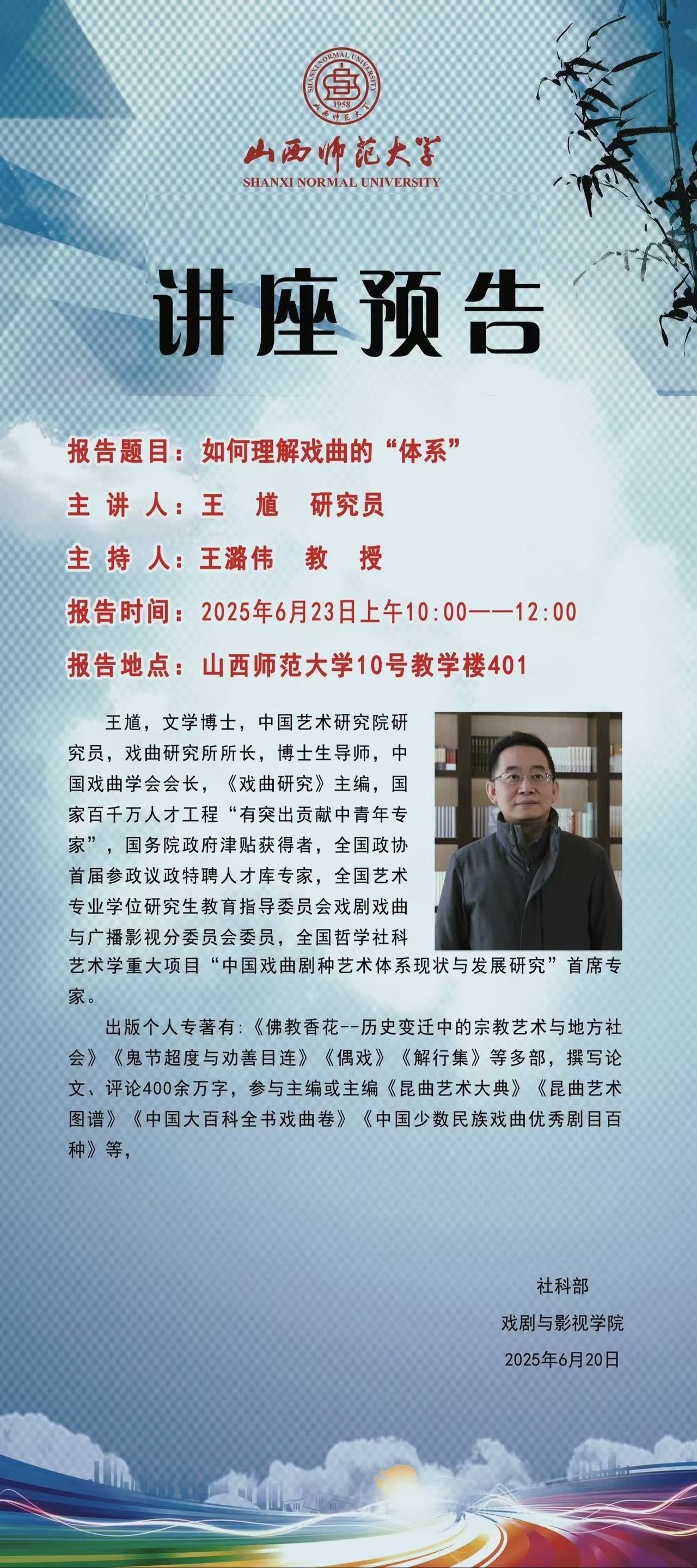公司拟于6月23日(周一)10:00-12:00在南区10号楼401会议室举办《如何理解戏曲的‘体系’》讲座,主讲人为王馗研究员,本次讲座由王潞伟教授主持。