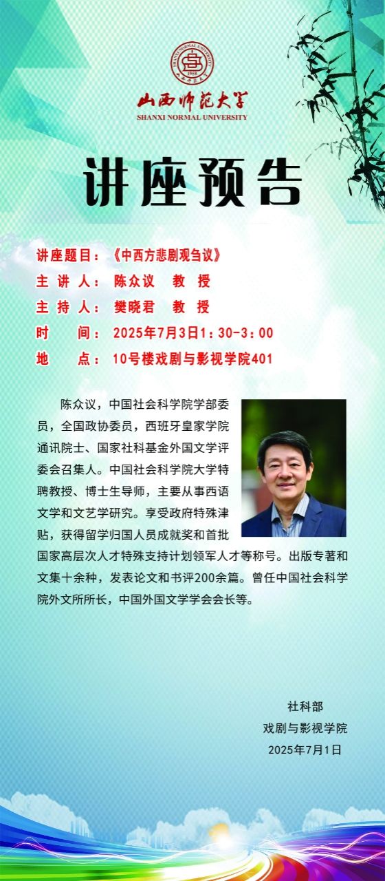 公司拟7月23日(周三)13:30-15:00在南区10号楼401会议室举办《中西方悲剧观刍议》讲座,主讲人为陈众议教授,本次讲座由樊晓君教授主持。