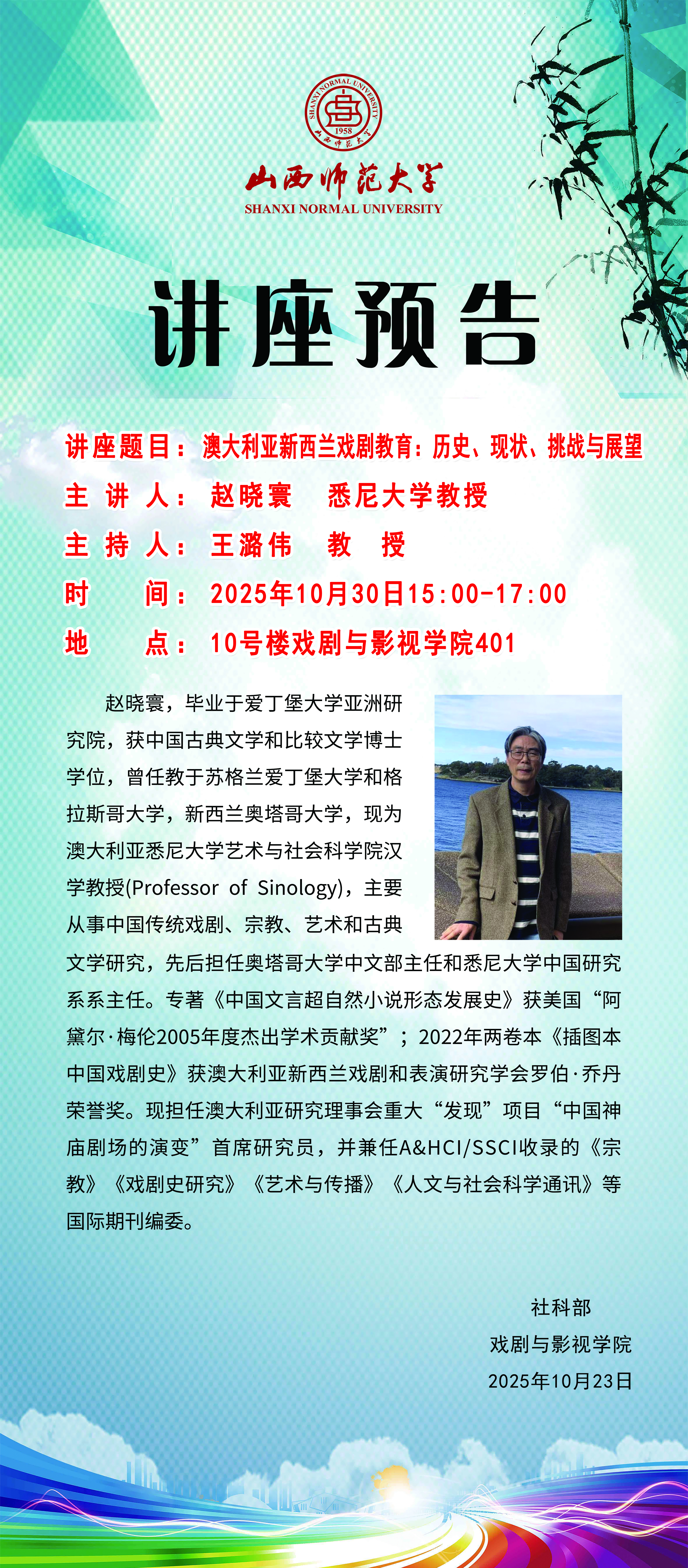 公司拟于10月30日(周四)下午15:00-17:00在南区10号楼401会议室举办《澳大利亚新西兰戏剧教育:历史、现状、挑战与展望》讲座,主讲人为赵晓寰教授,本次讲座由王潞伟教授主持。