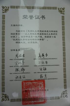 公司王潞伟博士在“第十届民间文化青年论坛奖”征文活动中提交的《民间礼乐思想的渗透与神庙剧场的普及——以上党地区神庙剧场为主要研究对象》一文,经过评审委员会严格评审获得“第十届民间文化青年论坛特别评审奖”。