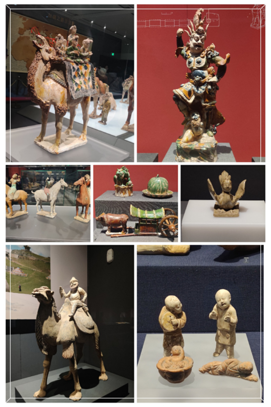 参观陕西历史博物馆时,从第一室春秋战国到第七室盛唐时期的文物陈列展,历代的文物精品荟萃其中,馆内陈列有百余件的浑厚凝重的铜器、绚丽夺目的陶瓷器、笔墨精妙的书画等。参观期间,讲解员对于文物的深度剖析令我们收获颇丰,大家为历史上的高超技术所折服。这些历史文物是历史和文化的重要见证,它们浓缩了古代文明的发展轨迹,展示了丝绸之路期间祖国同异域各国源远流长的密切联系,含有丰富的文化内涵。