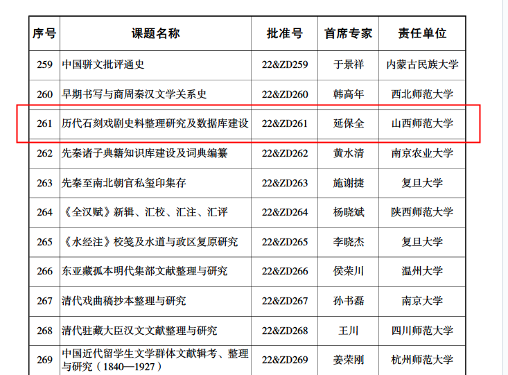 12月8日,全国哲学社会科学工作办公室公布2022年度国家社科基金重大项目立项名单,我院延保全教授作为首席专家申报的“历代石刻戏剧史料整理研究及数据库建设”获准立项。