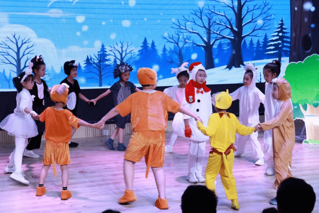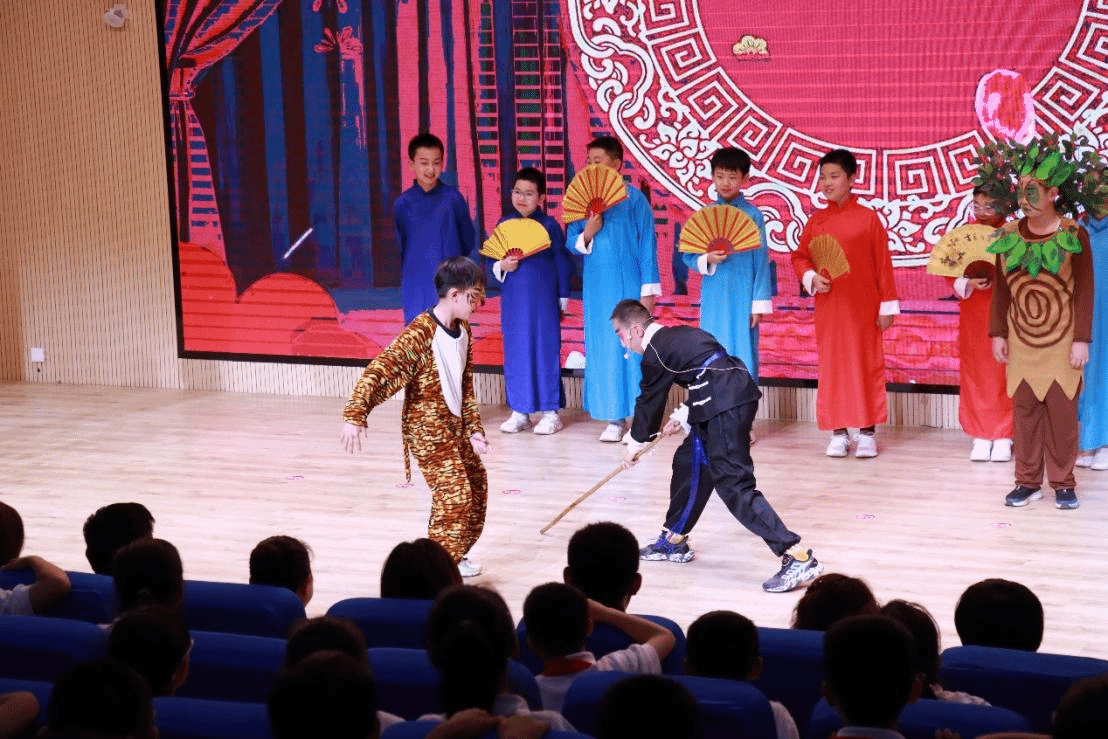 该演出由余莉婕、翟琦带领三名戏剧教育方向研究生张仝萱子、季雨蒙、安沛林完成。课程以小学二年级与五年级员工为实践对象,将语文课本搬上舞台,倾情演绎《我是一只小虫子》《雪孩子》《雷锋叔叔你在哪里》《猴王出世》《红楼春趣》《景阳冈》六个剧目,完成了一场文学与戏剧深度融合的戏剧教育实践展示。舞台上,小演员们自信的台词表达、丰富的角色表情和富有创造性的舞台表演,展现了戏剧教育在语言与肢体表达、团队协作、文化理解等核心素养培育上的显著成效。观众席中,师生与家长的阵阵欢笑和掌声,既是对孩子们精彩表现的肯定,也是对课程育人模式的认可。