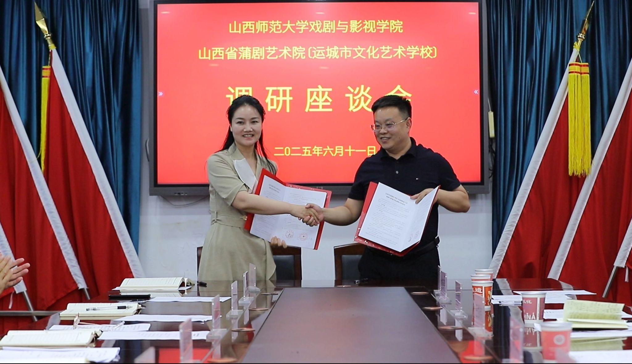 在与会领导与专家的共同见证下,经理王潞伟与山西省蒲剧艺术院(运城市文化艺术公司)党委副书记、院(校)长贾菊兰双方代表签署战略合作协议。