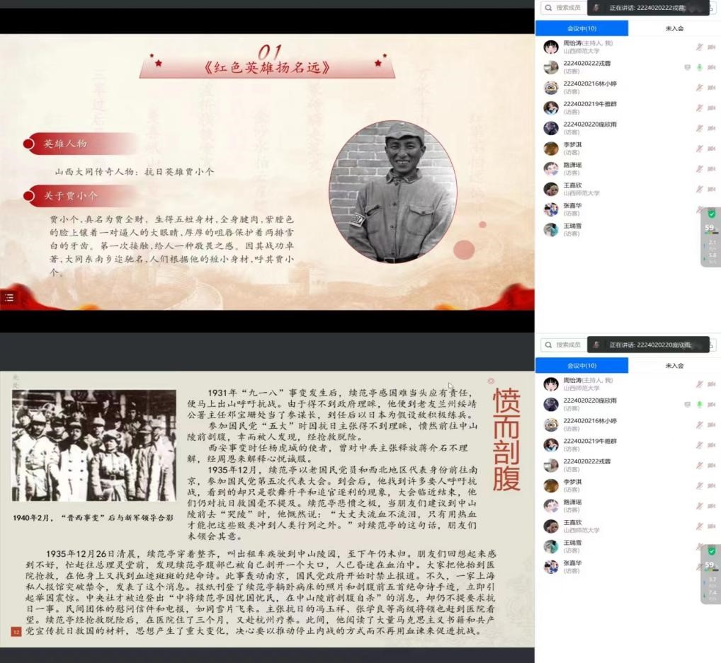 队员们分别到各自家乡附近的红色遗迹实地探寻,通过一幅幅历史照片、一件件文物文献、一座座纪念建筑还有一个个红色历史故事,回顾着那一段风起云涌的峥嵘岁月,感悟着先烈们伟大的革命精神。随后组内成员分别完成实地寻找并推选后,7月18日开展了线上分享交流会,队员们各自向大家分享了在实地寻找过程中被最少的人知晓的故事以及实践后的感受。分享过程中,队员们都认真聆听,仿佛回到了那个战火纷飞的年代,见证了一个个革命先烈的英雄人生。