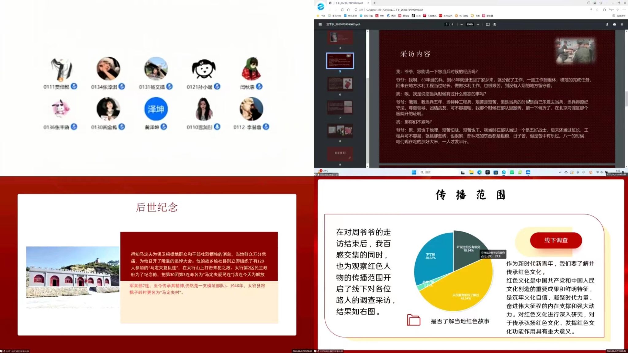 为深入学习贯彻党的二十大精神,用党的科学理论武装青年,用党的初心使命感召青年。乐天使“红色角落,你我寻觅”第六组同学于2023年8月2日开展线上分享会,围绕自己家乡周边的红色文化故事进行交流分享。