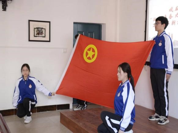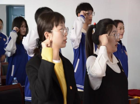 会议伊始,全体参会人员庄严肃穆,共同奏唱团歌,李蓓蓓老师为新发展的团员佩戴团徽之后,大家举起右拳,在新团员代表的带领下宣读入团誓词,同学们目光坚定、声音洪亮,在团旗下庄严承诺。