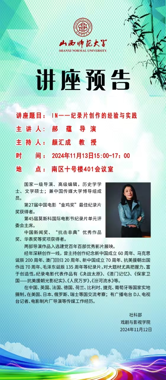 公司拟于11月13日(周三)15:00-17:00在南区10号楼401会议室举办《IN——纪录片创作的经验与实践》讲座,主讲人为郝蕴导演,本次讲座由副经理颜汇成教授主持。